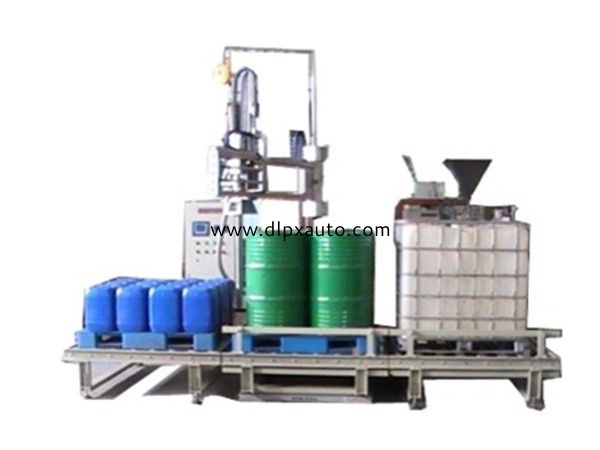 C、灌裝頭自動插入桶內,去除皮重,球閥和槍頭底閥打開進行快速灌裝,重量到達小料值時灌裝速度變小,重量到達目標量減提前量時二閥全關,灌裝頭自動提槍到桶外,防滴盤接液,誤差檢測并顯示……一直灌完4桶為止;(25L桶雙層灌裝時,先下降逐一灌完一層,再上升逐一灌完第2層)