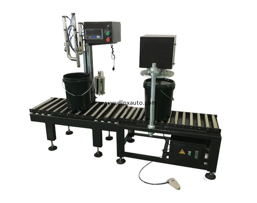應用案例YCS/20L高灌稱重式灌裝機 + 排氣壓蓋機YCS-P/20L由稱重傳感器、儀表控制系統(tǒng)、灌裝系統(tǒng)、封蓋機構、機架、輥道等組成。操作簡介:人工移上桶;手動啟動;自動開啟輸料泵及大小給料閥門;到設定工作點1自動關快給料閥門;到設定工作點2自動停輸料泵并關慢給料閥門;人工放蓋移桶至壓蓋位置;腳踏開關控制壓蓋,壓蓋結束人工移桶, 入庫。功能特點1.灌裝方式:液面上灌裝(頂部灌裝)。2.控制方式