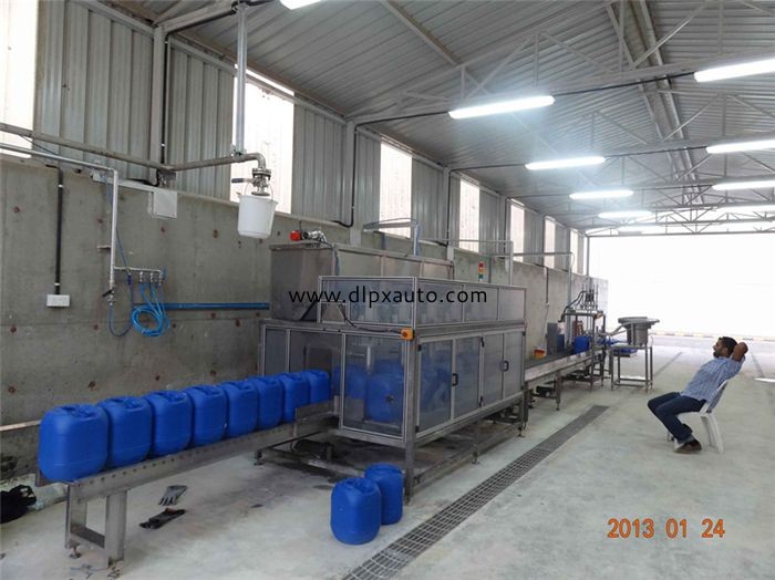 產地:上海特點:全自動,效益高,整套生產線適用范圍:石化、化工、日化,制藥,食品,農藥等流體使用說明手紅放桶一自動輸送一6頭自動定位稱重灌裝 自動理蓋一 自動旋蓋一 重 量檢測一-自動貼標- -自動噴碼一輸送到碼垛位一 半自動碼垛- 托盤輸送-叉車運走2.產品介紹:2.1.采用稱重灌裝傳感器,使用穩定、壽命長;2.2. PLC控制稱重,高精度;2.3.雙速灌裝(開始時快速灌裝,接近目標量時慢速灌裝