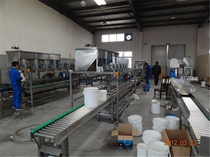 手紅放桶一自動輸送一6頭自動定位稱重灌裝 自動理蓋一 自動旋蓋一 重 量檢測一-自動貼標- -自動噴碼一輸送到碼垛位一 半自動碼垛- 托盤輸送