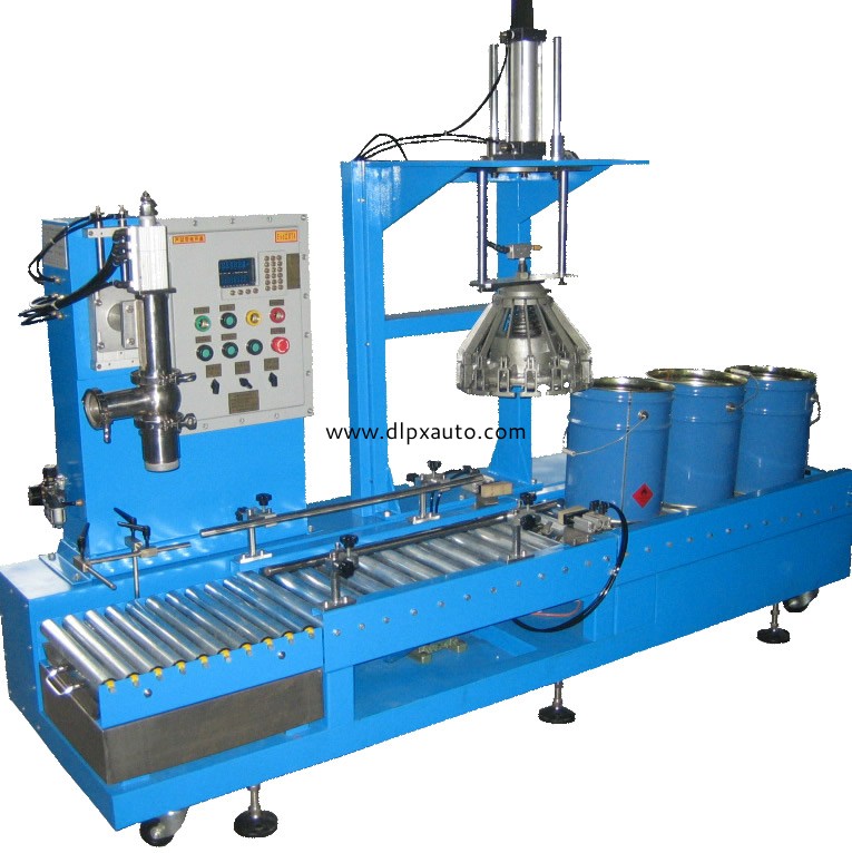 本設(shè)備是20L防爆式梅花壓蓋灌裝機(jī)(型號YCS-20L)廣泛應(yīng)用于化工、糧食、農(nóng)藥等與液體狀物料相關(guān)的行業(yè),適用在聚氨酯、多元醇、聚醚、聚酯、樹脂、涂料、油漆、油墨、膠粘劑、固化劑、染料、清洗劑、機(jī)油、潤滑油、食用油、香精、溶劑、助劑、農(nóng)藥及其他危險性化學(xué)產(chǎn)品等產(chǎn)品中。動作流程:人工將空桶放到秤臺上,,然后點(diǎn)擊啟動按鈕,儀表首先判桶并扣除空桶皮重,灌裝頭下降并插入桶內(nèi)并打開進(jìn)入快速落料,當(dāng)達(dá)到慢進(jìn)