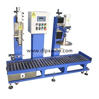 人工將空桶放到秤臺上,,然后點擊啟動按鈕,儀表首先判桶并扣除空桶皮重,灌裝頭下降并插入桶內(nèi)并打開進(jìn)入快速落料,當(dāng)達(dá)到慢進(jìn)料設(shè)定重量時,自動轉(zhuǎn)為慢速落料。當(dāng)重量達(dá)到目標(biāo)值時停止落料,此時灌裝頭復(fù)位到初始狀態(tài),儀表回皮顯示總重,人工將成品桶移出并人工放蓋推到壓蓋區(qū),腳踏開關(guān)啟動,壓蓋氣缸伸出并壓蓋,壓蓋完成人工取下桶,整個動作流程結(jié)束。