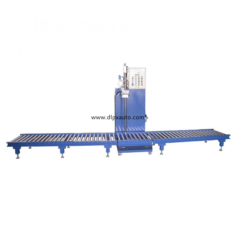 本設備是200L灌裝機(型號YCS-200L)。廣泛應用于化工、糧食、農藥等與液體狀物料相關的行業,適用在聚氨酯、多元醇、聚醚、聚酯、樹脂、涂料、油漆、油墨、膠粘劑、固化劑、染料、清洗劑、機油、潤滑油、食用油、香精、溶劑、助劑、農藥及其他危險性化學產品等產品中。動作流程:人工將空桶放到秤臺上,,然后點擊啟動按鈕,儀表首先判桶并扣除空桶皮重,灌裝頭插入桶內打開進入快速落料,當達到慢進料設定重量時,自