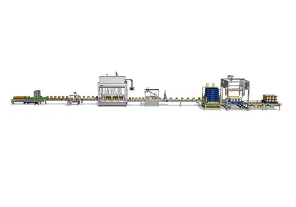 人工上空桶-空桶自動(dòng)輸送-空桶自動(dòng)尋口-自動(dòng)定量灌裝-自動(dòng)理蓋-自動(dòng)落蓋-自動(dòng)旋蓋-重桶自動(dòng)輸送-機(jī)械