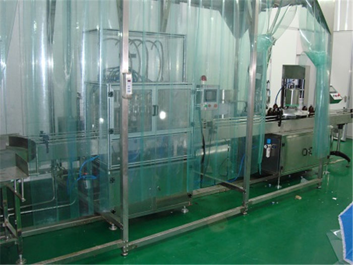 有輸送機將瓶子轉入灌裝位,自動灌裝,灌裝后再自動進入鎖蓋,當瓶子轉到自動鎖蓋過程中,瓶口碰蓋,后面從蓋槽中滑出一個瓶蓋在瓶口上,