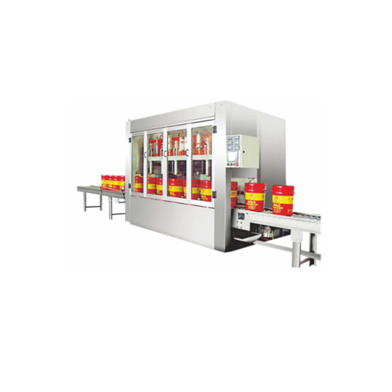 工作流程:空桶自動(dòng)輸送 - 空桶撥至稱重區(qū)同時(shí)自動(dòng)對(duì)桶口 - 空桶自動(dòng)除皮 - 自動(dòng)定量灌裝 - 自動(dòng)推重桶至鏈板輸送線 - 自動(dòng)上蓋同時(shí)自動(dòng)鎖蓋 - 重桶輸送到重桶待提區(qū) - 人工提走即完成